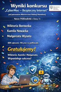 Z ogromną radością informujemy, że Wiktoria Borowska, Kamila Nowacka oraz Małgorzata Wysota z klasy 7c zostały półfinalistkami ogólnopolskiego konkursu „CyberMoc – Bezpieczny Internet”, organizowanego pod patronatem Ministerstwa Edukacji Narodowej.