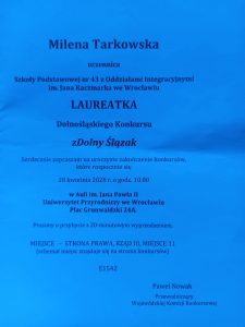 Z dumą informujemy, że wśród nagrodzonych znalazła się nasza uczennica – Milena Tarkowska, która została laureatką konkursu z biologii. To wyjątkowe osiągnięcie jest efektem jej ciężkiej pracy, pasji oraz zaangażowania.